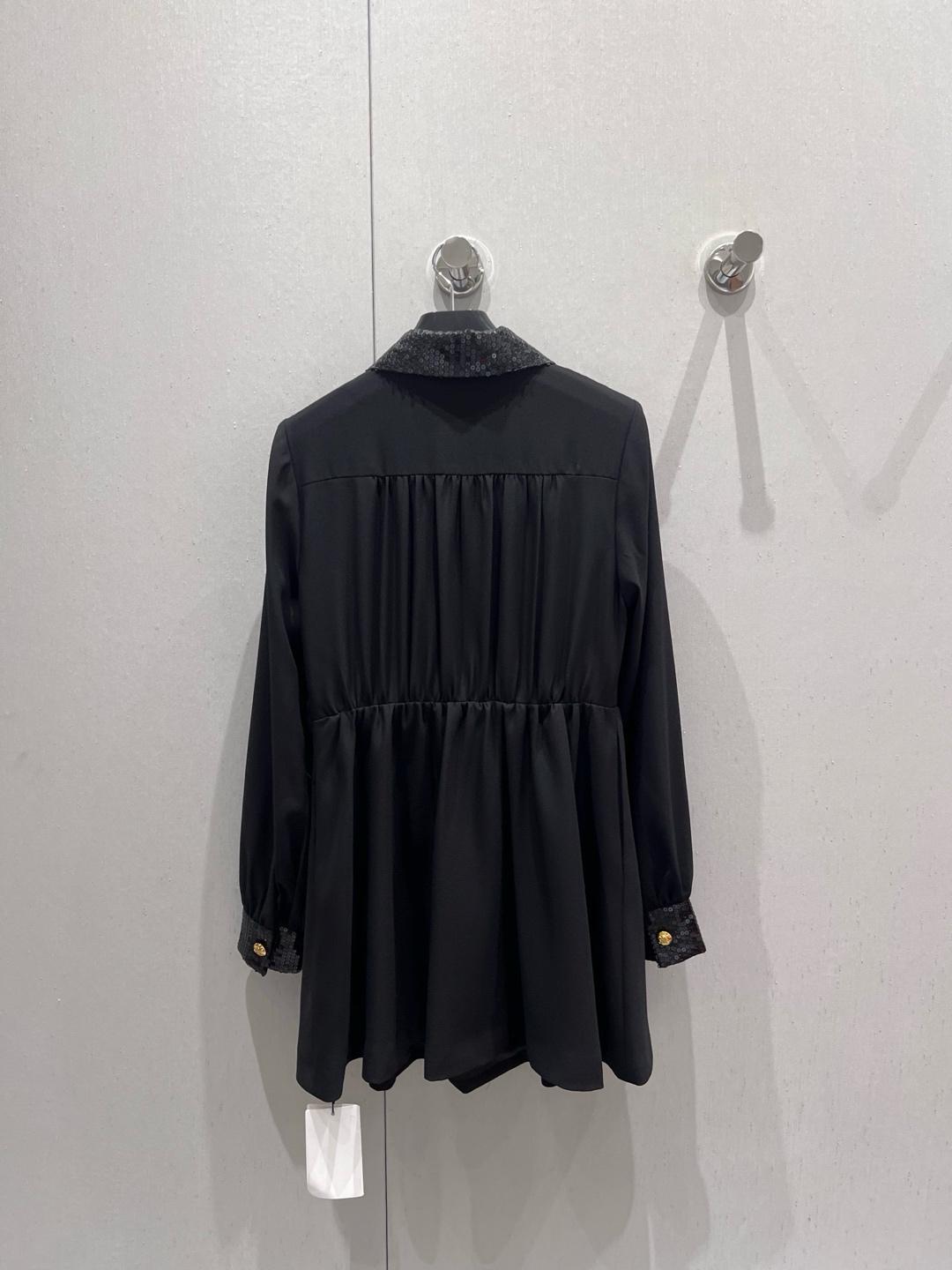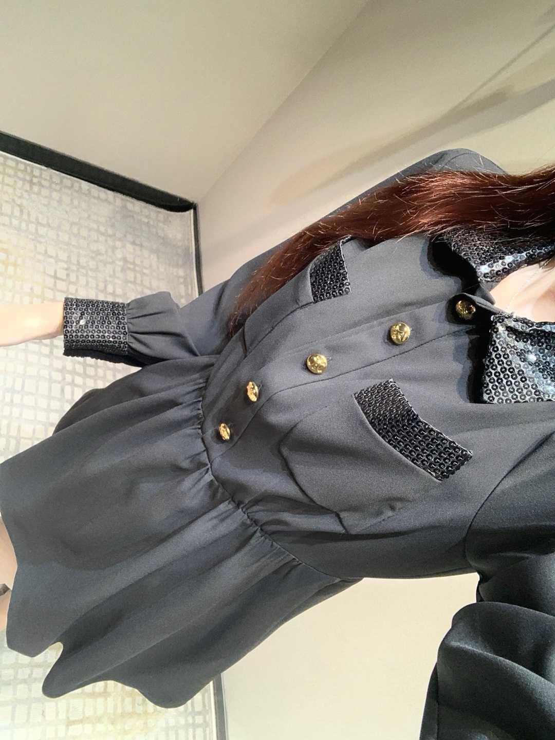 Celine 25SS Early Spring New Collection – Sequin Collared Dress, exclusively crafted in a high-end version! Handmade sequin-embroidered pleated waist dress, exuding elegant fashion. The sequin collar and cuffs are paired with decorative pocket edges, creating a harmonious and captivating look with stunning details. The golden Arc de Triomphe buttons add a signature brand touch. With a moderate length and pleated waist design, it perfectly blends sophistication and charm.